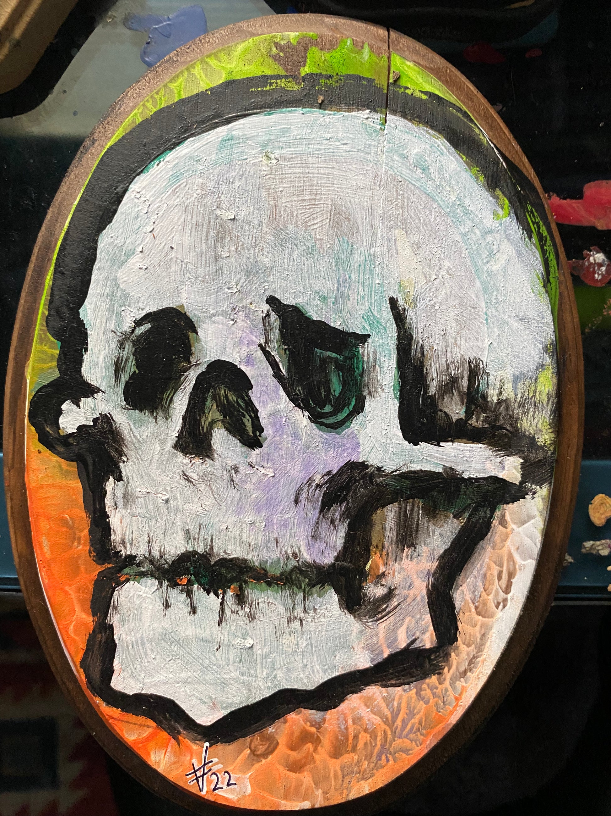 An acrylic skull painted on a 4x6 piece of wood.