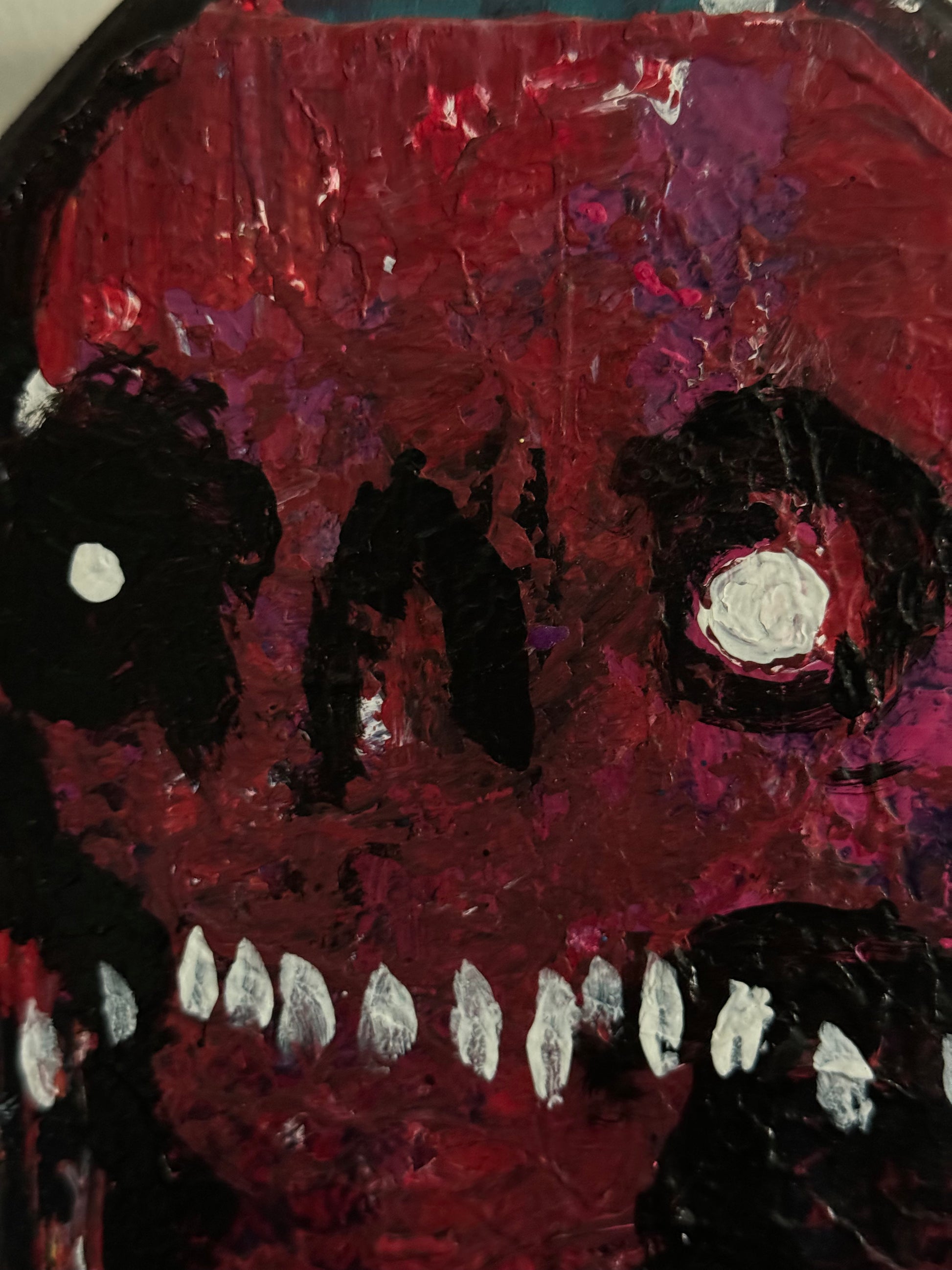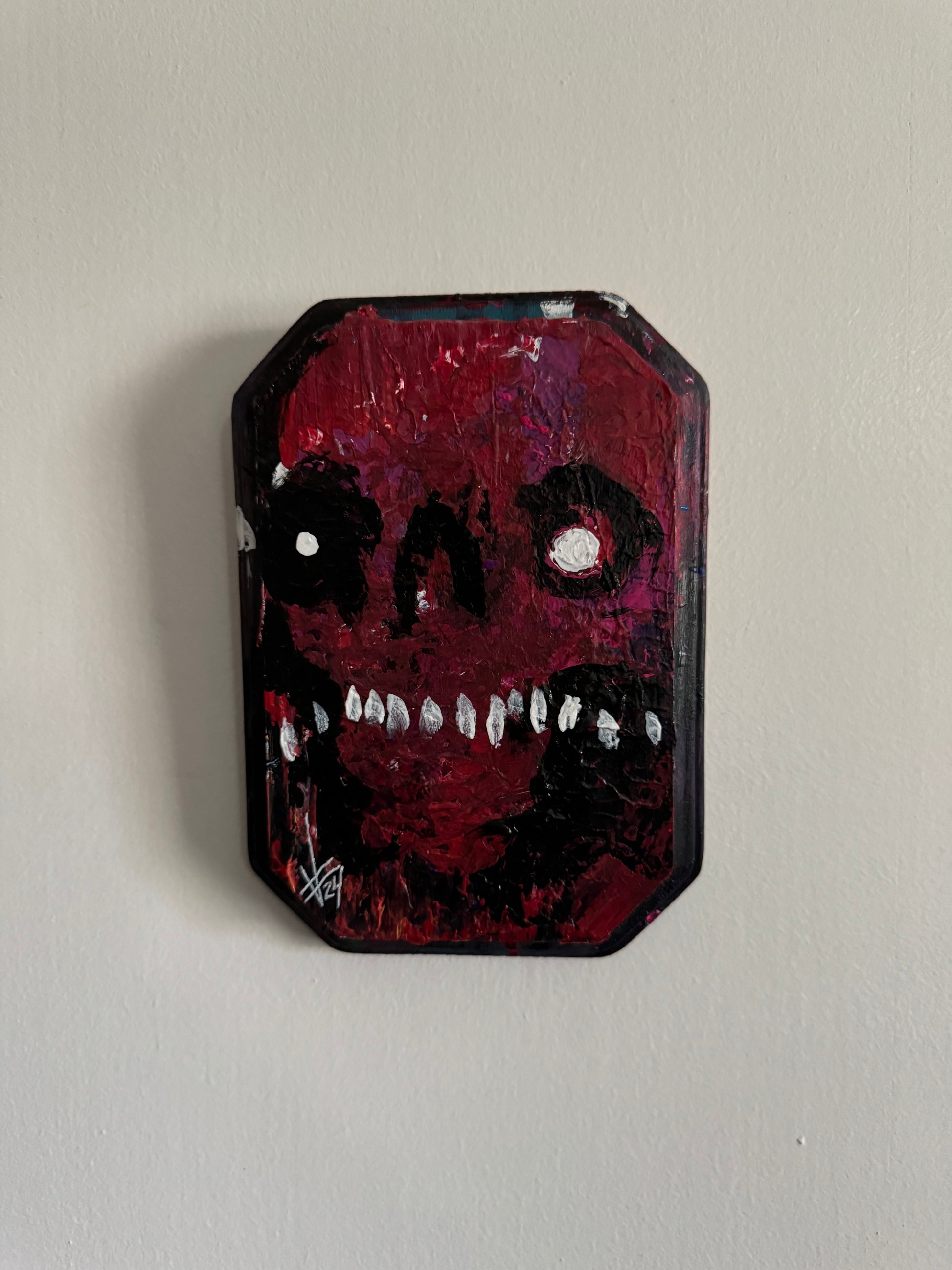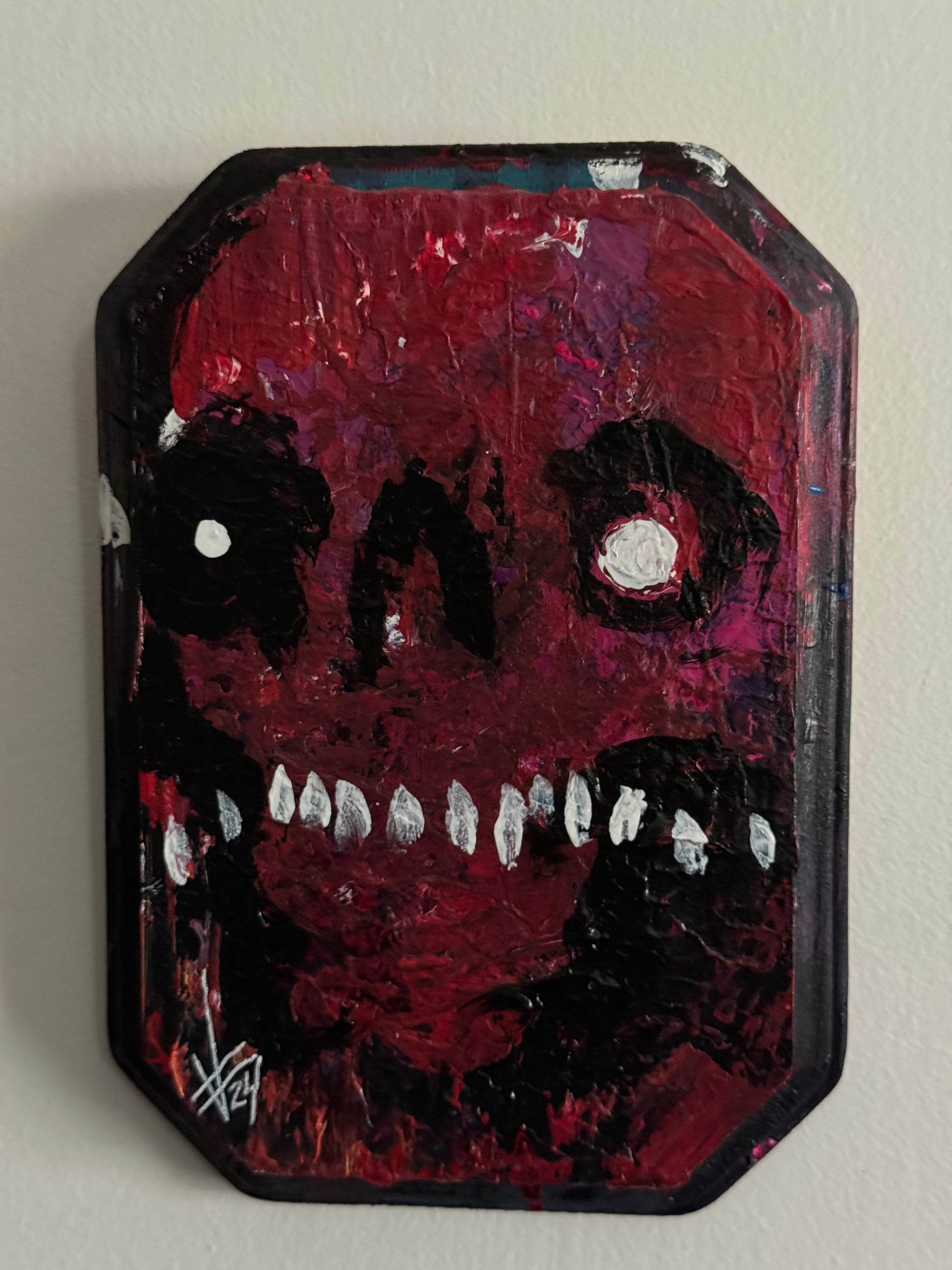 An original painting that wants a peep and is pushing themselves out of the painting, acrylic on roughly 5x7 piece of wood.